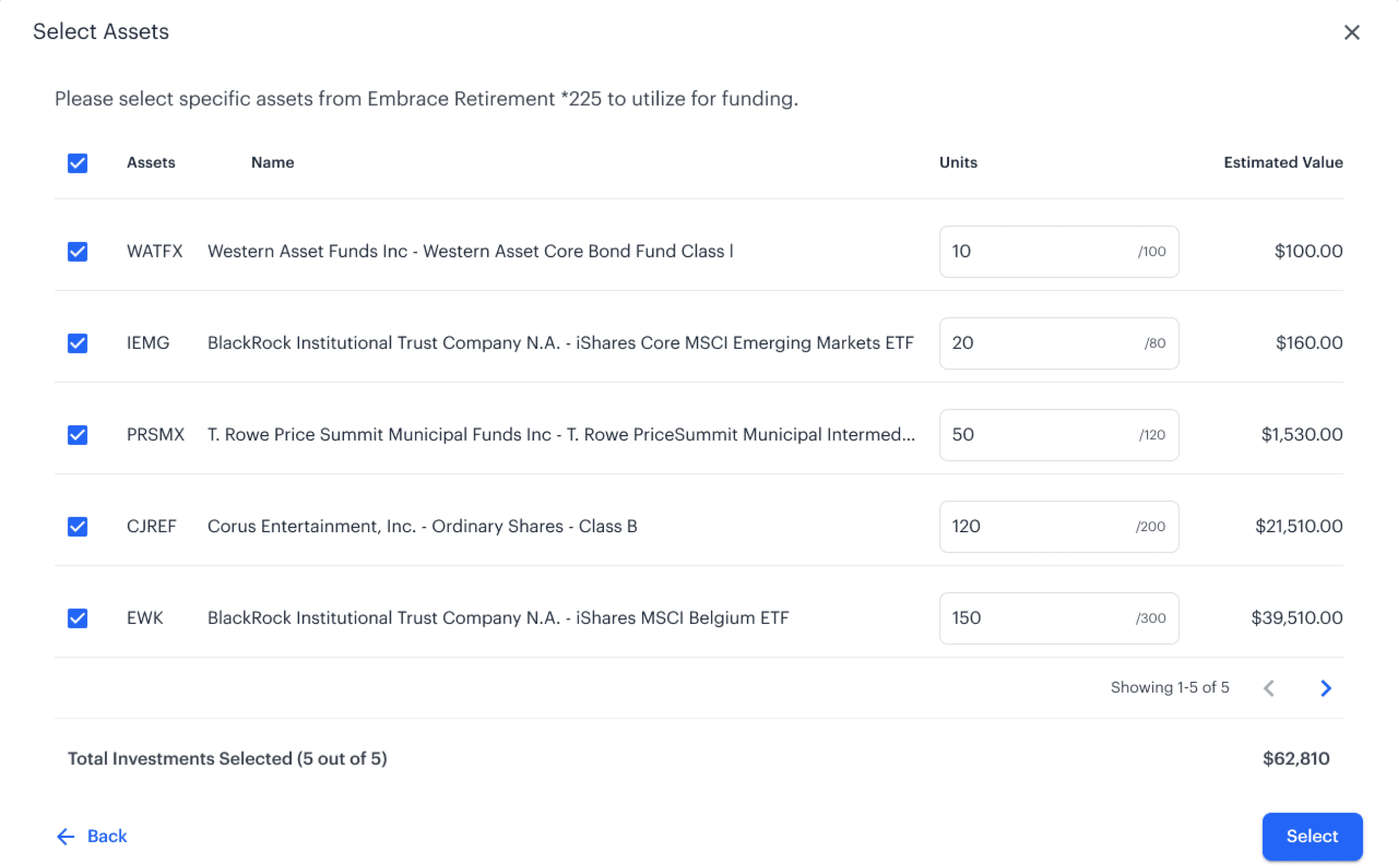Users are provided the option of choosing which assets they would like to liquidate for funding.