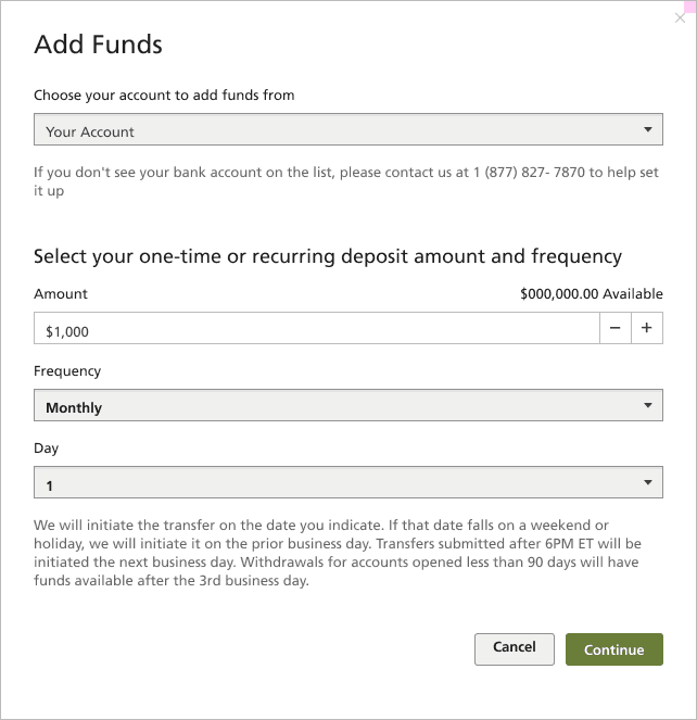 You currently have no bank accounts available. Please call us at 877-827-7870 or schedule an appointment with a Financial Advisor to set up a bank account to add funds from.
