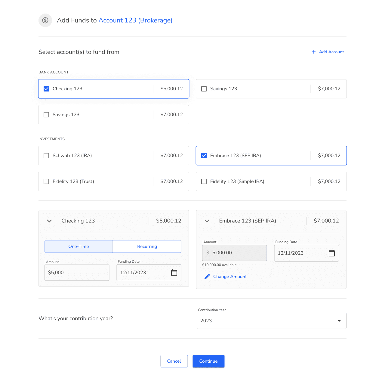 It’s not immediately clear which account the user is funding. While the header mentions "Add Funds to Account 123 (Brokerage)," this context is visually disconnected from the rest of the flow